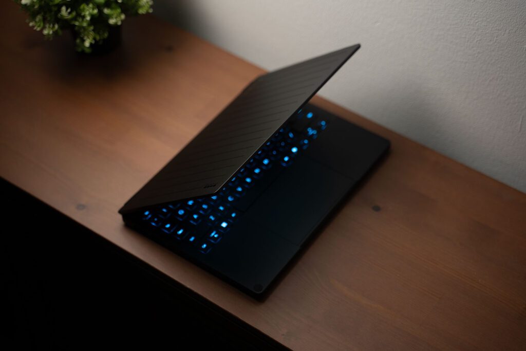 Első kézbevételkor azonnal érezni, hogy ez nem egy szokványos ultrabook. A ház masszív, fém, a GoPro-ihletés pedig nem tolakodó, de hasonló sem fogunk sűrűn találkozni. Valamennyire azt is sugallja, hogy ez a gép nem irodai Excel-táblákra készült, hanem terepre, forgatásra, utazásra. A 360 fokban kihajtható zsanér miatt tablet módban is használható, ami egy gyors helyszíni vágásnál vagy prezentációnál meglepően praktikus tud lenni. Különösen kevés az erős gépek között az érintőképernyős, tabletté alakítható modell.