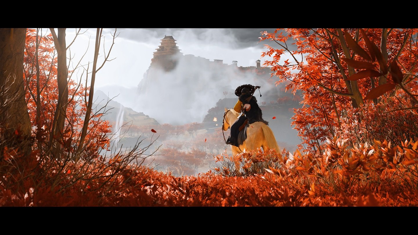 A látványt nem is tudom, hogy kell-e méltatni, hiszen beszélnek helyettem a mellékelt képek. A játék ugyanolyan gyönyörű, mint az elődje, sőt talán még szebb is, hiszen a Sucker Punch grafikusai jobban megtanulták kottázni a PS5 lehetőségeit. A színpompás növényzet és a festői táj hívogatóan terpeszkedik a képernyőn és a felfedezést is segíti, mert például egy távolban meglátott felszálló füst elcsalogatja a játékost akkor is, ha egyébként egy fontos küldetésben van éppen. Ezzel együtt kellőképpen változatosak is a helyszínek, amit élmény bebarangolni – a fotó mód jelen esetben nem csak egy kötelező, futottak még kellék, hanem gyakran fogjuk meghívni. A művészi hatást és beleélést támogatja a Kurosawa mód visszatérte (fekete-fehér, klasszikus szamuráj filmeket idéző kép világgal), de akad Miike-mód is, ami Takashi Miike munkásságát megidézve rengeteg sárt és vért vegít a látványba. A teljesség kedvéért pedig említsük meg a Shinichirō Watanabe-módot is – ez inkább a hallójáratainkat kényezteti az ismert anime-rendező által készített lo-fi zenéket felvonultatva.