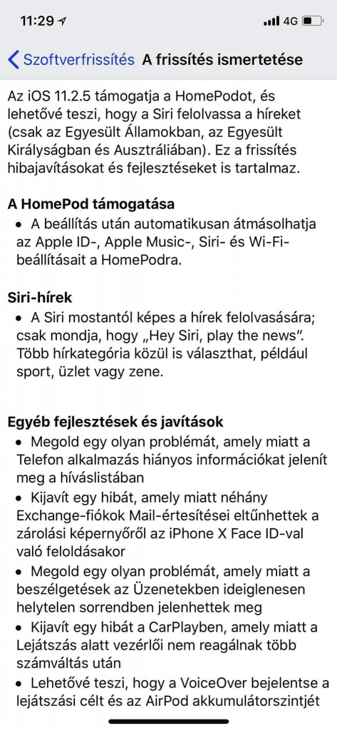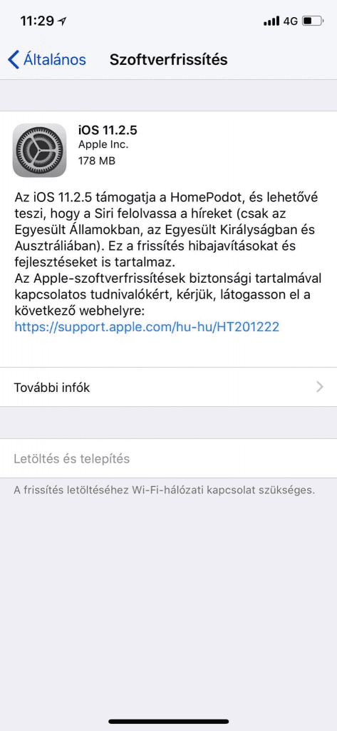 Az Apple újabb iOS frissítést tett közzé, ez már a 11.2.5-ös verzió. A kompatibilis készülékekre vezetékmentesen (OTA) elérhető csomag nagyjából 178 megabájtot emészt fel, legalábbis iPhone X esetén ennyire lehet számítani.
