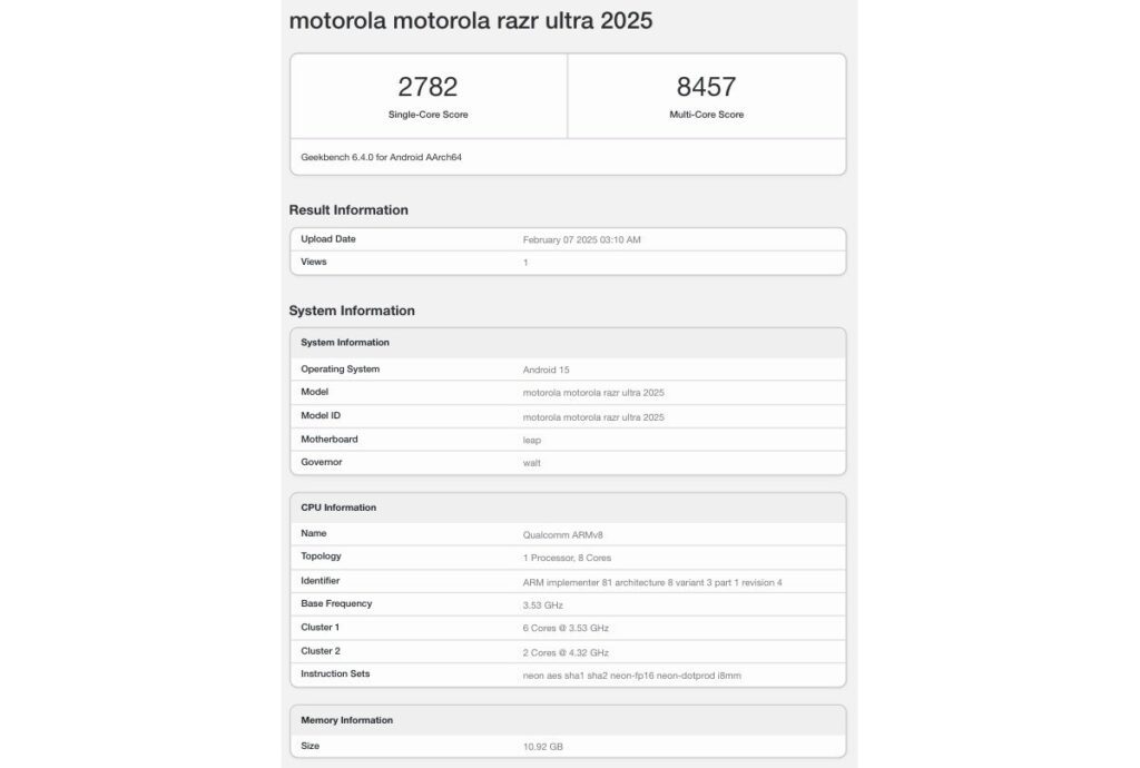 A kiszivárgott információk alapján arra lehet következtetni, hogy a Qualcomm Snapdragon 8 Elite SoC-je hajtja majd a gyártó legújabb összecsukható készülékét. Ez azért jelentős, mert a Razr 50 Ultra / Razr+ 2024 a Snapdragon 8s Gen 3-mal készült, ami teljesítmény szempontjából messze elmarad a Snapdragon 8 Gen 3-tól. Úgy tűnik tehát, hogy a Motorola idén végre a Qualcomm aktuális zászlóshajó chipsetjét fogja használni. A telefon 2782 egymagos és 8457 többmagos eredményt ért el, ami kevesebb, mint amit néhány más, hasonló chipkészlettel szerelt készüléktől láttunk, de ebben közrejátszhat a kompakt és különleges kialakítás.