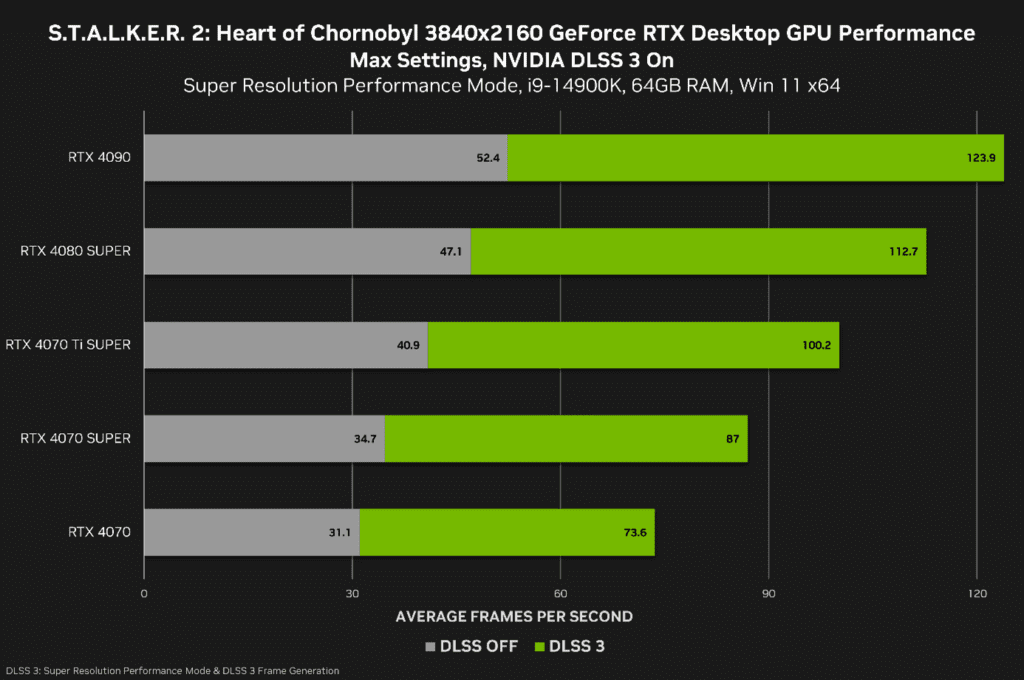 A posztapokaliptikus világ szerelmesei bizonyára nagyon várták már a S.T.A.L.K.E.R. 2: Heart of Chornobyl megjelenését, mely szintén az első naptól kezdve támogatta az NVIDIA megoldásait, így a fejlesztők kemény munkája még nagyobb élményben tárult a játékosok elé. 4K felbontásnál, minden beállítás maximális értékénél a DLSS 3 a Frame Generation és a Super Resolution segítségével átlagosan 2,4-szeresére növelték a S.T.A.L.K.E.R. 2: Heart of Chornobyl képkockasebességét a GeForce RTX 40-es sorozatú kártyák. A GeForce RTX 4070 SUPER 87 FPS-sel fut, a GeForce RTX 4070 Ti SUPER 100 FPS-t, a GeForce RTX 4070 SUPER 112 FPS-t ér el, amely messze veri például a konzolokat, ráadásul 4K-ban, maximális részletességben.