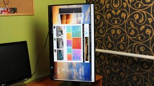 A talpa az elejét leszámítva teljesen kör, a monitor 350 fokban forgatható. Emellett magasságban kb 15 cm a mozgástartománya, illetve -5 és 30 fok között dönthető. Hovatovább még pivot módban is használható, jobbra 90 fokkal el tudjuk fordítani. Nem ez a legvékonyabb panel, amit életemben láttam, de nagyon jól használható és mindenki megtalálhatja a számára kedvező szöget.