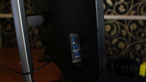 A bal oldalán van három darab USB 3.0 port, ahova csatlakoztathatjuk perifériáinkat, így értékes portokat spórolhatunk meg a számítógépben. Ehhez persze van egy USB-B port, amin keresztül számítógéphez kell kötnünk a monitort, hogy a három USB-t és a webkamerát használni tudjuk.
