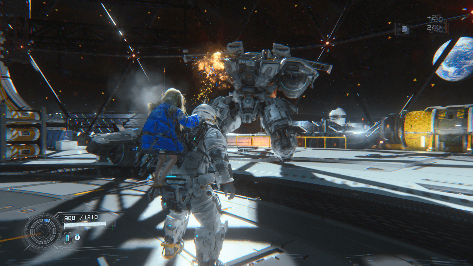 Nem maradhatnak el a manapság már kötelezőnek számító soulslike elemek sem, de nem kell megijedni, simán hozható a dolog normál fokozaton és nem fog kihullani az összes hajunk. Életerőnk nem töltődik automatikusan és csak a korlátozott számban nálunk lévő, korlátozott erejű életjavítókkal gyógyulhatunk. Van egy állandó alapfegyverünk és lehet nálunk ezen felül 3 taktikázást segítő kiegészítő fegyver is. Léteznek az úgynevezett bonfire-re hajazó pontok, ahol pl. vissza tudunk menni a hubként szolgáló szobába fejleszteni és életerőnk és a “medkitek” is visszaállnak, cserébe minden legyakott ellenfél is vissza teleportálódik. Ez sem jelenthet problémát, mert vannak combosabb fejlesztési lehetőségek, melyek során mindkét karaktert és még számos egyéb aspektust tudunk tápolni, csak győzzük nyersanyaggal.