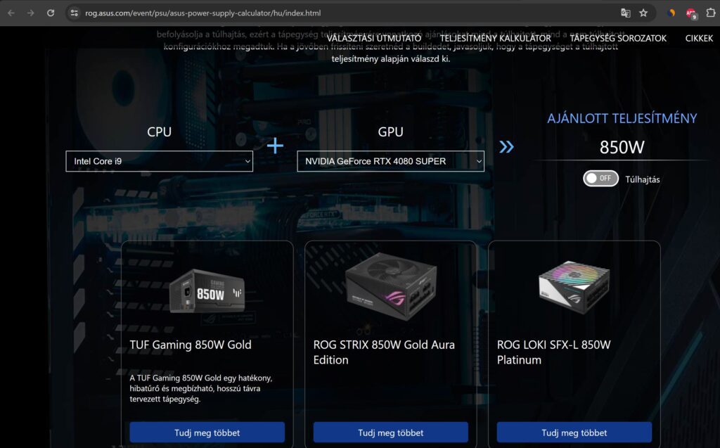 Az új kártya beszerzésekor pedig érdemes arra is odafigyelni, hogy megfelelő tápegységet válasszunk hozzá, hiszen ezek az „erőművek” erős és stabil tápot igényelnek. A gyártó honlapján például ehhez a modellhez egy 850 Wattos egységet javasolnak, de az ASUS készített egy dedikált online kalkulátort, mely számos hasznos információ és tipp mellett a bevitt adatok alapján meg is állapítja, hogy mekkora tápegységre lenne szüksége az adott felhasználónak. Külön kiemelendő, hogy ha az adott kategóriában többféle modelljük is elérhető, akkor azokat is listázza, tehát nem „kényszerít” minket a legdrágább változatra, illetve azt is megadhatjuk, hogy tervezzük e túlhajtani a kártyát, és akkor egy kategóriával minimum erősebb tápokat fog ajánlani.