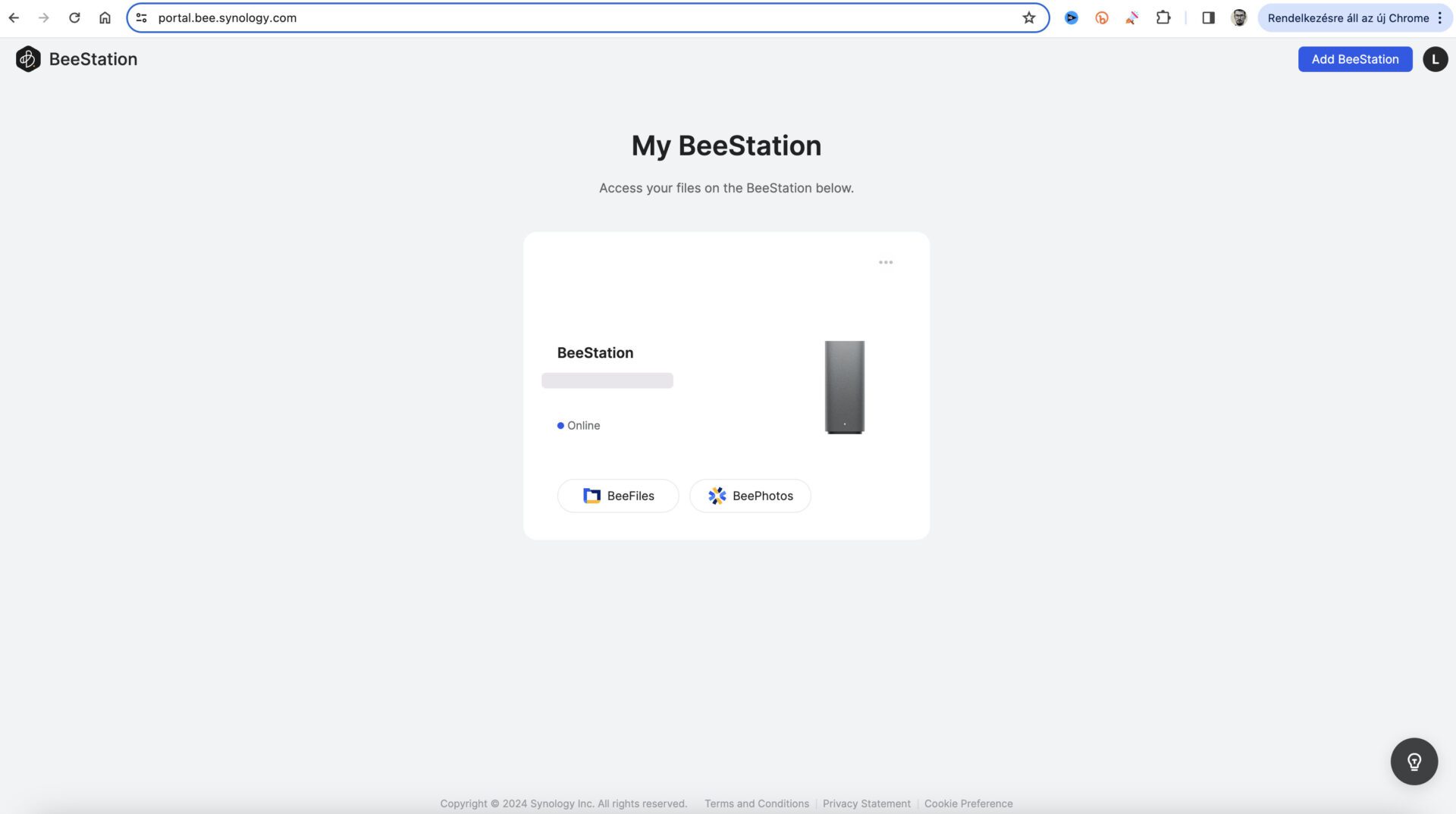 A beüzemelés annyiból áll, hogy áramra és hálózatra csatlakoztatás után olvassuk be az útmutatóban lévő QR kódot. Létre kell hozni egy Synology fiókot, amit egyébként Google fiókhoz is lehet társítani, ehhez fogja a BeeStationt hozzáadni. Ennél bonyolultabb dologra nem is kell számítani, pár perc és máris használatra kész.
