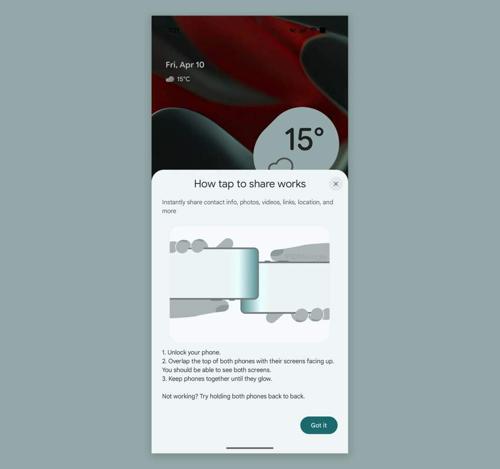 Végre a Google is elkészítette saját „NameDrop” alternatíváját Androidra, és a friss szivárgások szerint a funkció a Tap to Share nevet kapja. A megoldás lényege ugyanaz, mint az NameDrop esetében, vagyis két telefon egyszerű összeérintésével lehet adatokat megosztani.