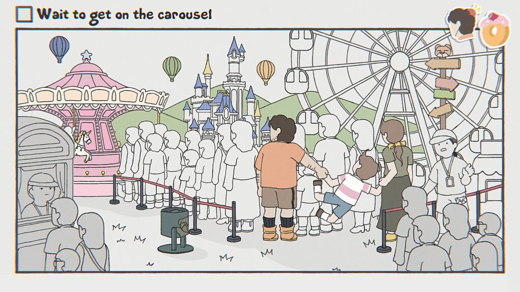 Nagyjából minden pályán 4-5 teendő van, amelyeket matricák is jelölnek, valamint a to-do listánkon is ott vannak. Persze csak virágnyelven, hogy ne legyen egyértelmű. S a While Waiting-nek pont ez a titokzatosság a lényege. Mert ha akarjuk, végigjátszhatjuk úgy is, hogy hozzá se nyúlunk a kontrollerhez és lepörög magától a száz szint. De a 4-5 órányi játékidőt érdemesebb az extra teendők felfedezésével tölteni. Egyrészt jól esik megtalálni ezeket, másrészt ugye a várakozás (mindig ez az utolsó task a sorban) hihetetlenül unalmas.